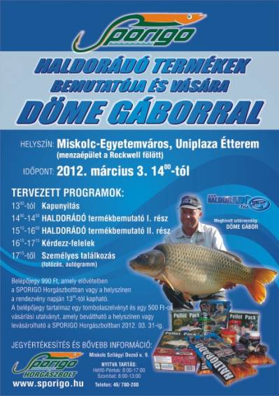 |   Döme Gábor az idei évben is több helyszínre ellátogat, hogy személyesen mutassa be a Haldorádó termékpaletta 2012 évi újdonságait, válaszolhasson a megjelent horgászok kérdéseire a termékekkel és a horgászmódszerekkel kapcsolatban is. 2012.március 03-án Miskolcon tart előadást a Sprigo horgászbolt szervezésében.